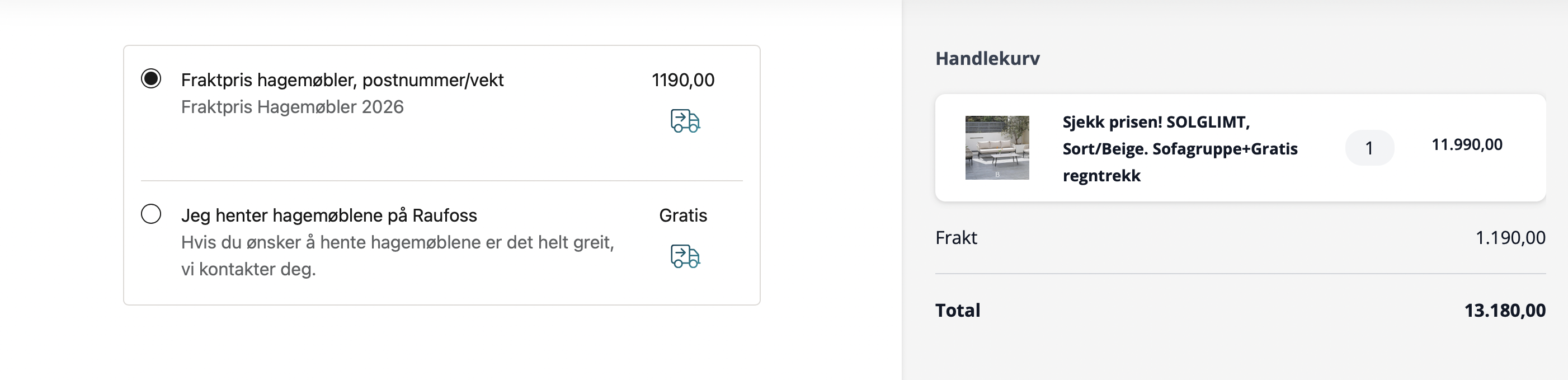 Frakt beregnes automatisk når du legger møbler i handlekurven og ditt postnr. Fraktpris er pr komplette gruppe.